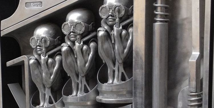 Und dann ist da noch der Alptraum. Wer nichtahnend vom Marktplatz die schmalen Gassen von Gruyères bis zum Burgtor entlangläuft, wähnt sich auf einmal in einer anderen, dunkleren Welt. Ein Monstrum aus Stahl, halb Mensch, halb Maschine, mit dolchähnlichen Stacheln bewehrt, hält vor dem Eingang zum Seitenflügel des Chateaus Wache. Darüber: ein Drache, der bereit scheint, mit seinen scharfen Klauen aus der Luft zuzuschlagen. Die Skulpturen sind eine Warnung. Hinter der Tür beginnt das dunkle Reich von HR Giger, dem Schweizer Surrealisten, der als Schöpfer des „Alien“ im gleichnamigen Film von Ridley Scott berühmt wurde. Käme Heidi hierher, sie würde schreiend wegrennen.