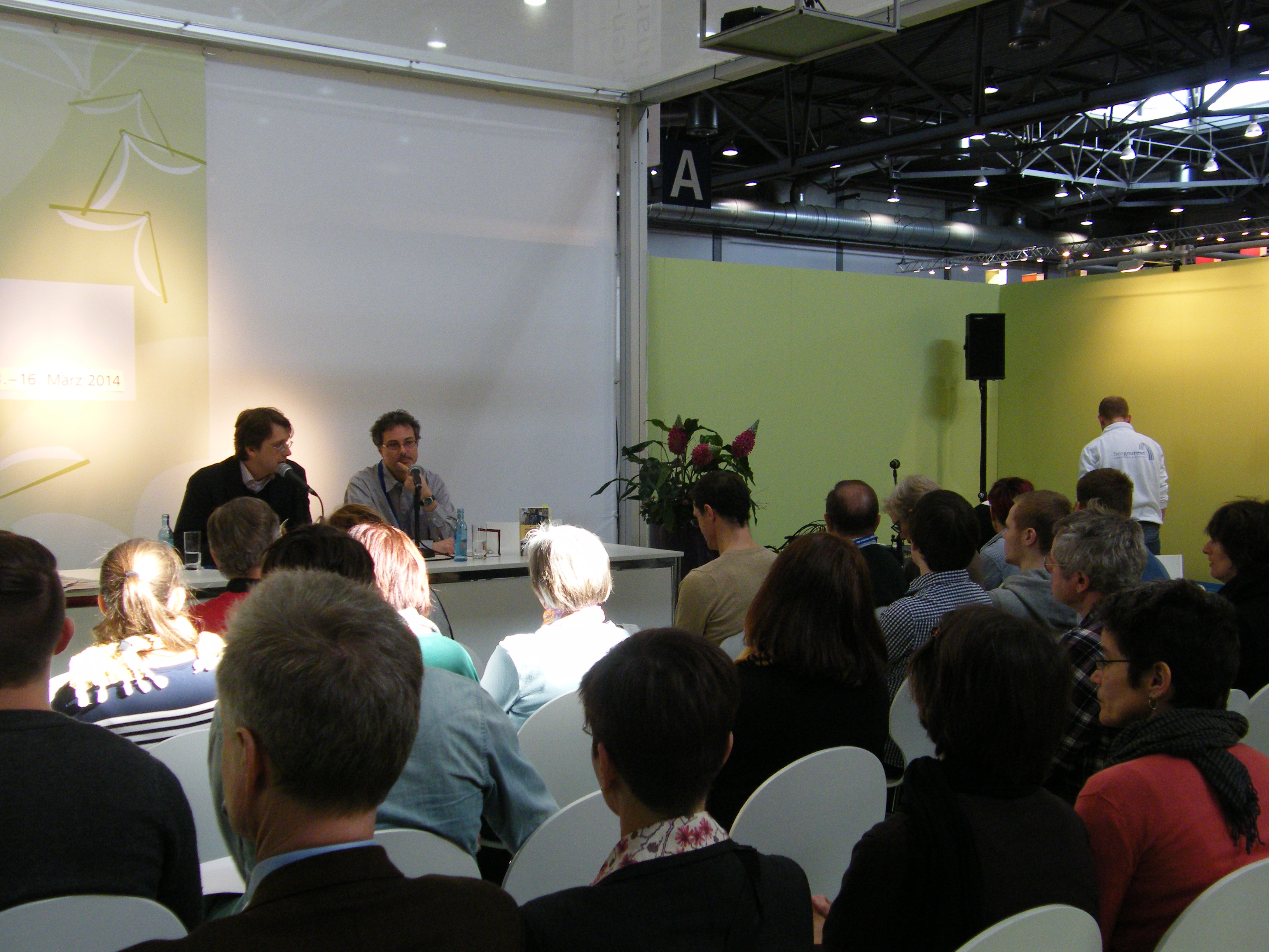 Im klassischen Messerahmen, aber dafür prall gefüllt die Afrika-Lesung am nächsten Morgen auf dem Sachbuchforum. Das Interesse war riesig, und während der halben Stunde im Gespräch mit meinem Lektor Patrick Oelze blieben immer mehr Leute an der Leseinsel stehen – vor so einer Menschentraube (mehr als 100 Leute!) ist die Zeit nur so dahingeflogen.