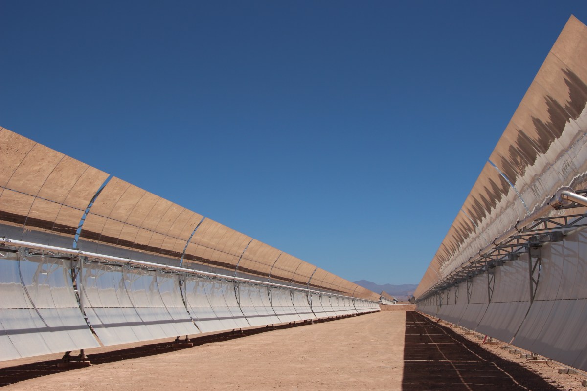 Eine von 800 Reihen mit neun Meter hohen Parabolspiegeln im Solarkraftwerk Noor, die je nach Sonnenstand ausgerichtet werden können.